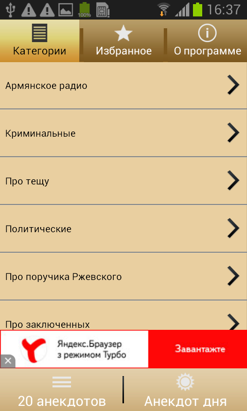 Множество категорий - армянское радио, Петька и Чапаев, отцы и дети, Шерлок Холмс, SMS-анекдоты, лучшие, поручика Ржевский, новые русские, черный юмор и много других.
