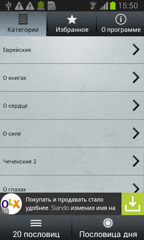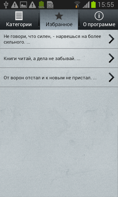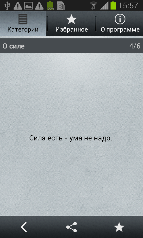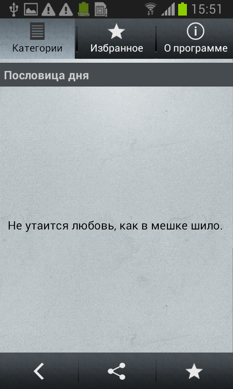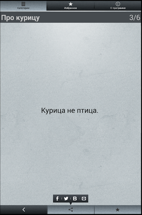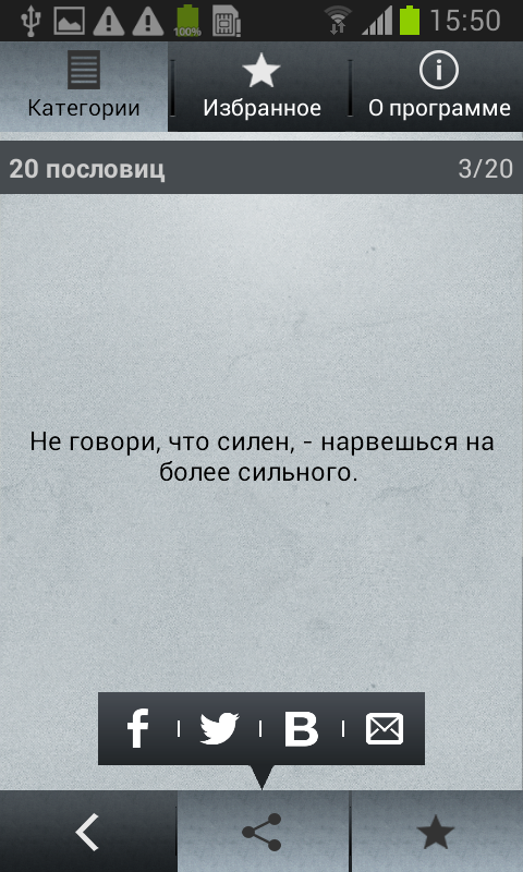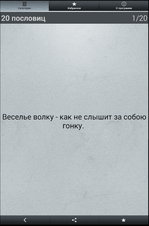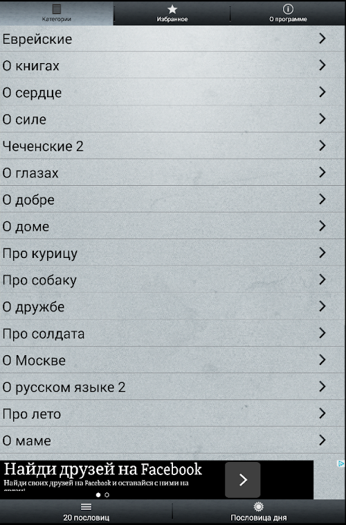 - The ability to share proverbs through VKontakte, Facebook, Twitter;