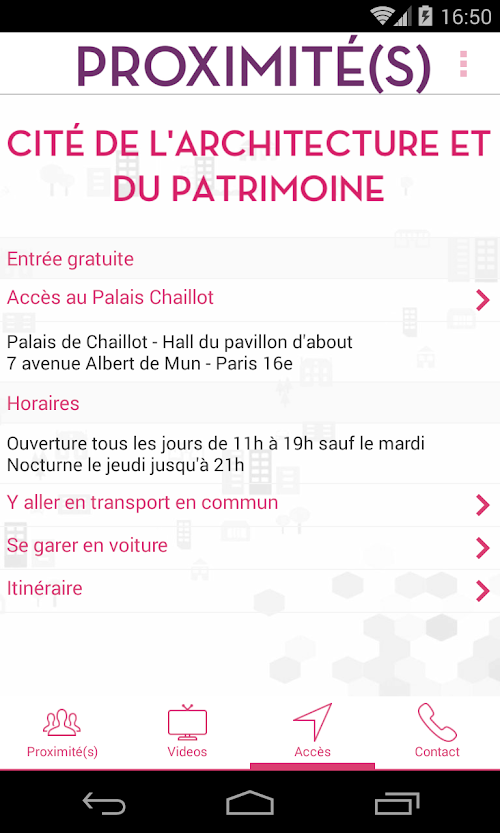 The application shows the different sequences of the exhibition, curated by Frédéric Mialet, and videos on site (s) in the city of tomorrow. You will also find all the practical information to get you there.