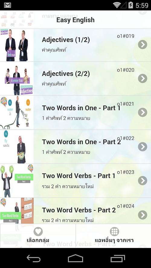 ตัวเลข, ความต่างของภาษาอังกฤษ, สี, คำกริยาช่อง 3, สัตว์, อาหาร, วัน เวลา, อากาศ ฤดูกาล, ถามทาง บอกทาง, คำคุณศัพท์, 1 คำศัพท์ 2 ความหมาย, รวม 2 คำ ความหมายใหม่, สนามบิน, อารมณ์ ความรู้สึก