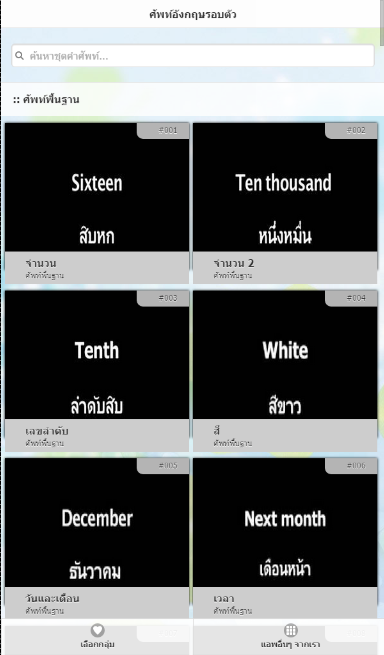 จำนวน, เลขลำดับ, สี, วันและเดือน, เวลา, ร่างกาย, เสื้อผ้า, กีฬา, ความรัก, บันเทิง, แมลง, สัตว์, สัตว์ทะเล, อาหาร, ผัก, ผลไม้, อาชีพ, รถยนต์