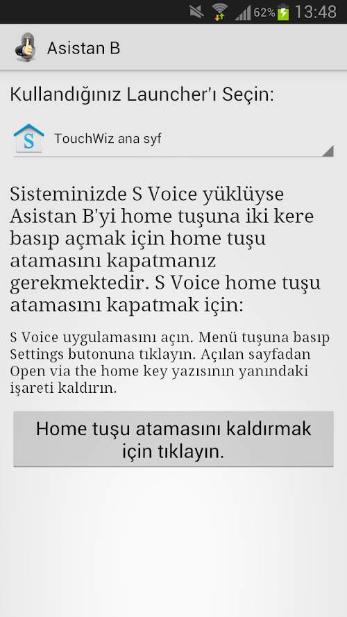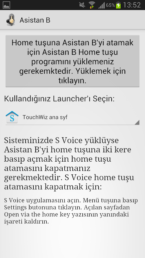 Uygulamayı yükledikten sonra bir kere home tuşuna basıp gelen pencereden varsayılan olarak Asistan B Home Tuşu uygulamasını seçmeniz ve ardından Asistan B içinden ayarlara girip Home tuşu ayarlarını düzenlemeniz gerekmektedir.Assistant B application home button (middle button) is required to run the application by pressing twice to.