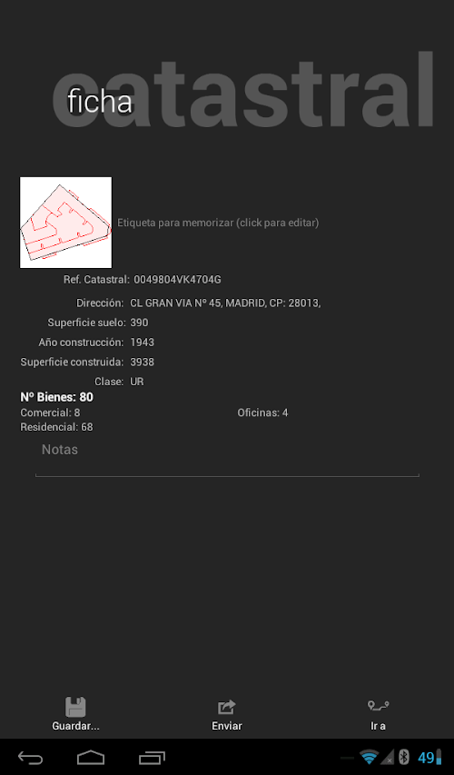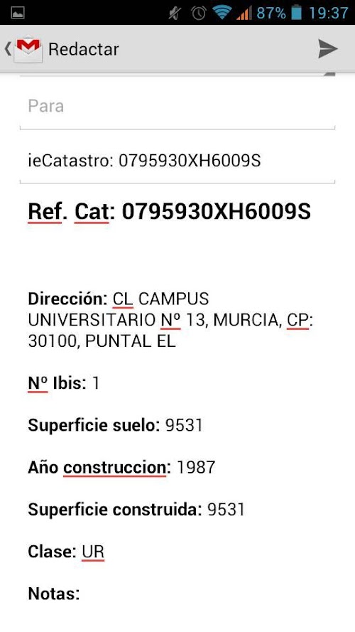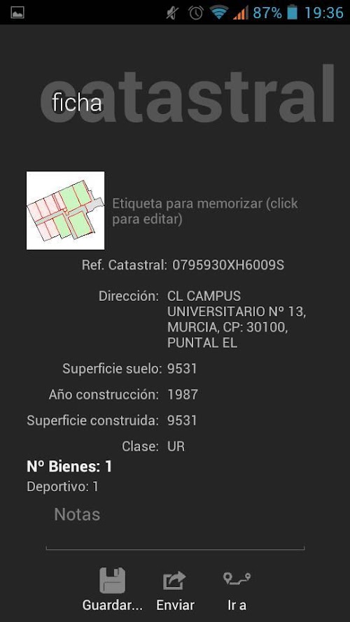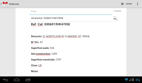 ieCatastro allows you to not only check the cadastral information but annotate and save it regarding a plot or construction. Also, you can easily share this information stored by emailing cadastral files in which you're working.