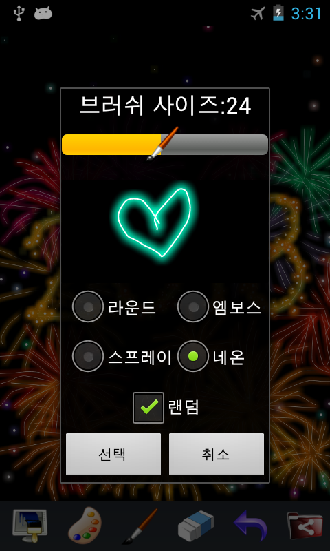 배경화면 컬러링에 4종류의 브러쉬 스타일(라운드, 엠보스, 스프레이, 네온)에 모두 랜덤컬러가 가능하며, 저장하기, 공유하기(메일, 페이스북, 트위터, 카카오톡 등 모든 SNS에 공유 가능)를 지원합니다.