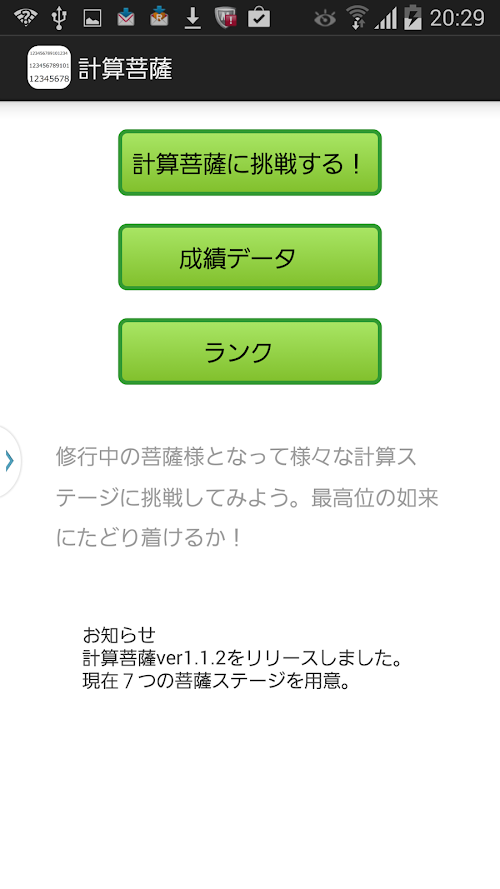 ユーザーは修行中の菩薩(ぼさつ)様というシチュエーション設定で、計算ステージをクリアしていくとランクが上がっていき、最終的に如来(にょらい)を目指すというものです。