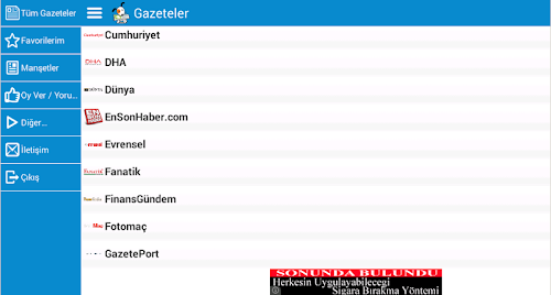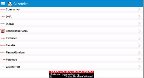 Uygulama haber özetleri için sitelerin rss servislerini kullanmaktadır. Rss servisi bulunmayan gazetelerin ana sayfaları gösterilmektedir.Newspapers Android Application newspaper reading programs and news app you can see the first page of the cuff buttons of the daily newspaper you can read all the news you can browse the pages specially created and click if you want to the site every newspaper and news current news for each of the major newspapers and news sites in Turkey,