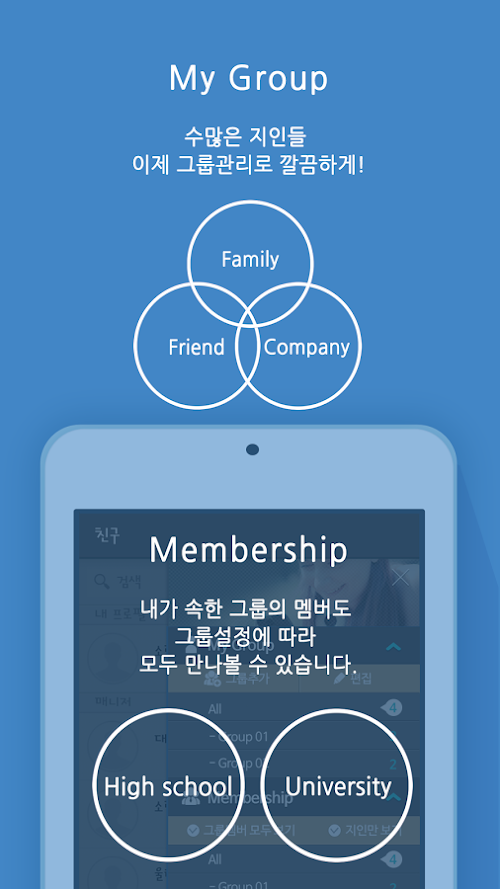 모든 사용자는 가족, 친구, 동문, 회사등 여러그룹을 생성하여 많은 지인들을