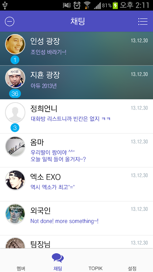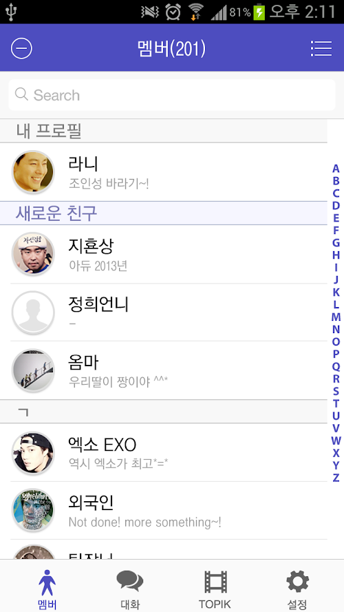 대화 중 다른 대화상대를 검색하거나 그룹별로 초대하여 그룹채팅이 가능하고,