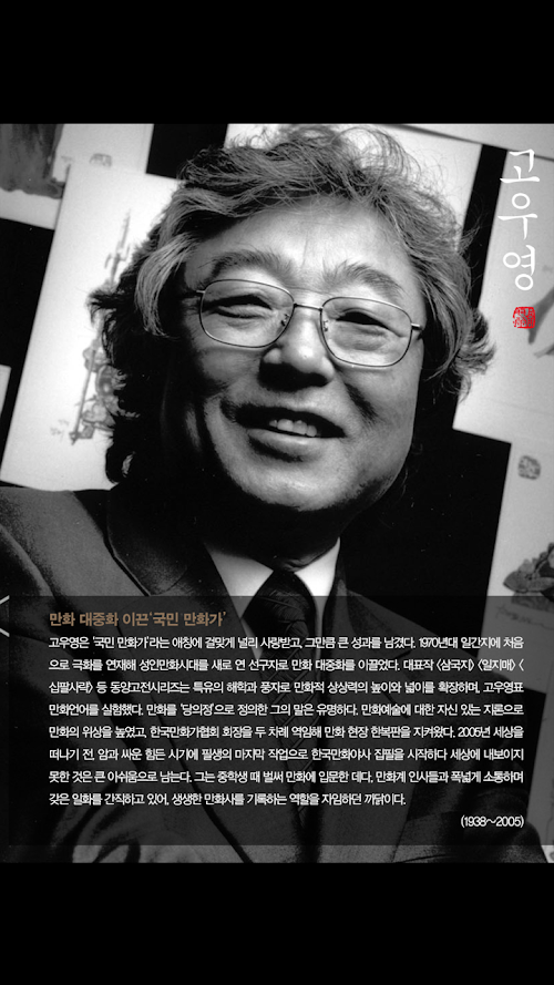 Gowooyoung teacher and 'National Cartoonists' widely known nickname befitting, that left great achievements as a writer. Polarized for the first time in the 1970s, among the adult cartoon series, a pioneer in open era led to the popularity of our comics. _ Three Kingdoms, suhoji, chohanji, sippalsaryak _ including unique oriental touch to the classic comic masterpiece it is moved.