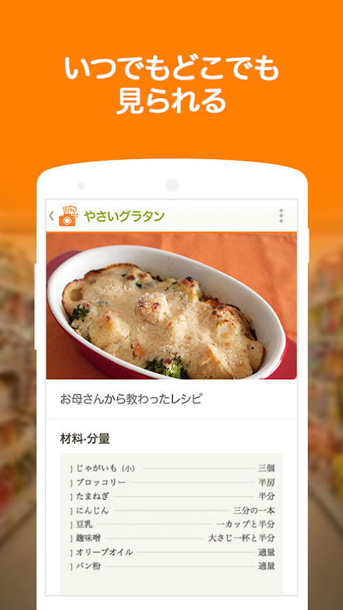 雑誌やテレビ、母直伝のレシピなど、「残しておきたい!」と思ったすべてのレシピを写真で保存しておくことができます。