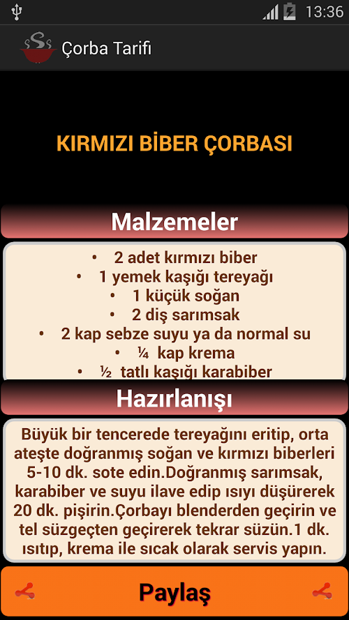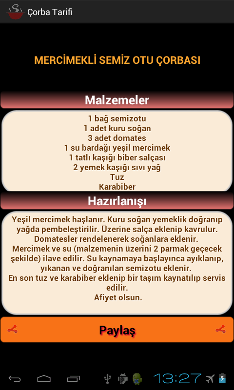 Çorba Tarifi uygulaması ile birbirinden güzel çorbalarımıza internet kullanmadan bedava erişebilirsiniz.Çorbalarımız yöresel ve modern mutfaklardan seçilmiştir.Tarifler titizlikle ve denenerek yapılmıştır.Çorbalarımız 6-8 kişilik olup hazırlanış kısmı ile bu sayıyı düşürebilirsiniz.Afiyet olsun.The beautiful soup Soup Recipes app to use the internet to our local and modern cuisine from our erişebilirsiniz.çorba free seçilmiştir.tarif our yapılmıştır.çorba 6-8 people trying out meticulously and with some preparation and düşürebilirsiniz.afiyet get this number.