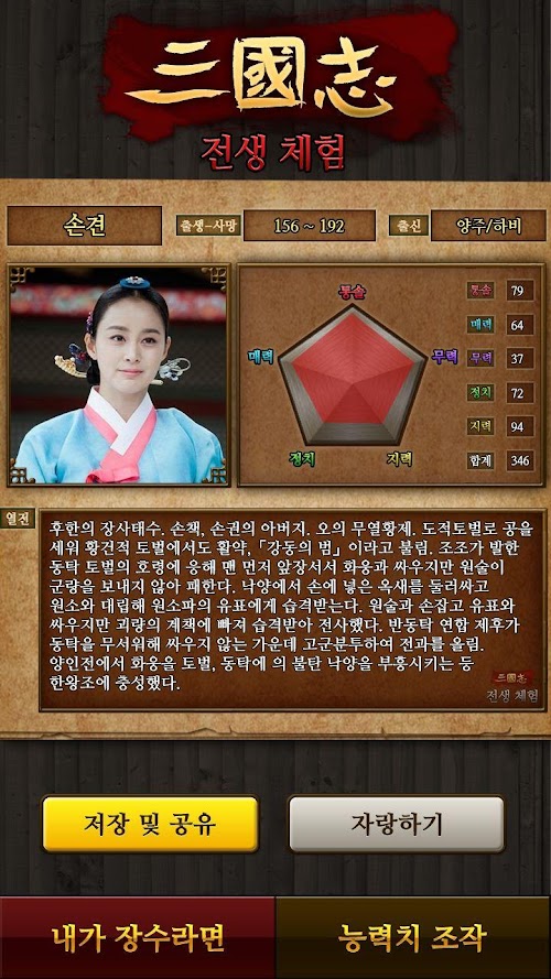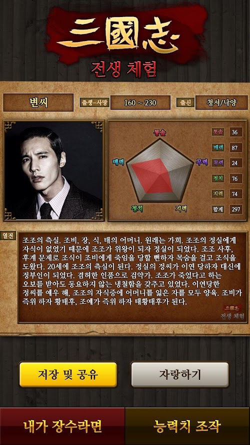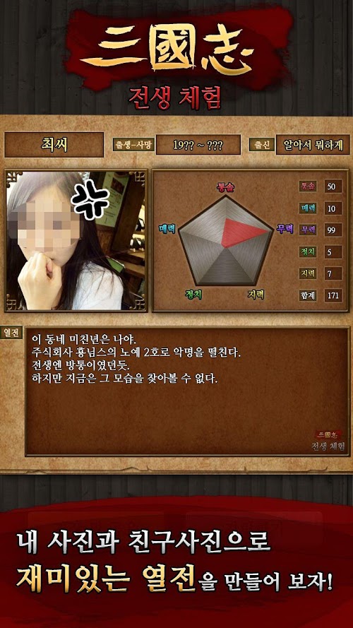 [삼국지 전생 체험]앱은 자신의 사진 혹은 친구 사진을 넣어 능력치 조작 및 재미있는 열전을 쓸 수도 있어요!