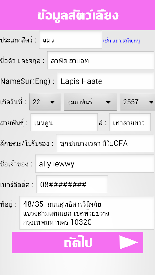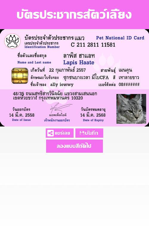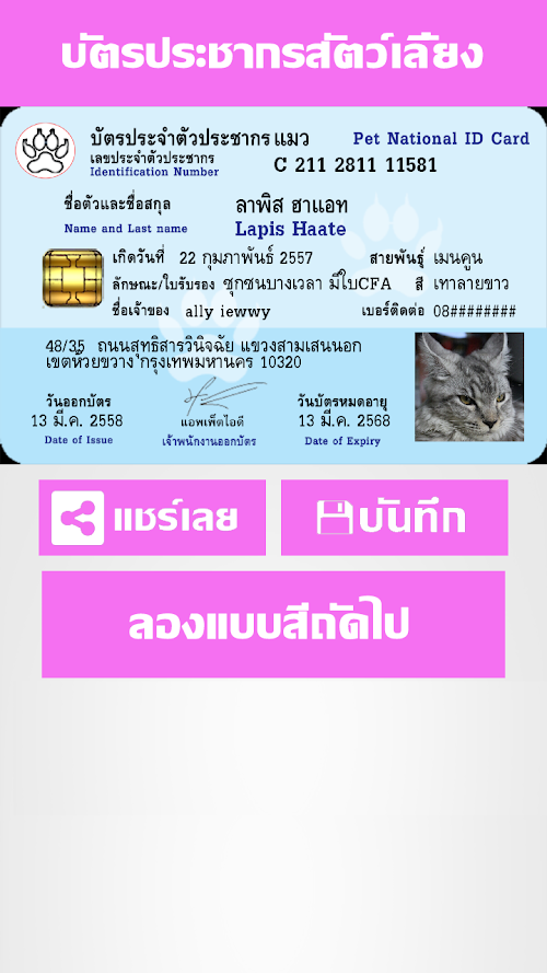 - บัตรนี้ออกโดยแอพเพ์ตไอดี ที่มีลายเซ็นนี้เท่านั้นApplications can create cards pet population (Pet. ID) quickly and beautifully. Fill in your pet. Then select the photo or photos to create a full population Pets (Pet ID) with colors. In order to create beautiful cards to keep or PIM into a taxi. Pet store information in the form of a card is quick and easy to come up with a new look. That comes with the option to share the post-phase line and other records, or save it straightaway. Analysis indefinitely