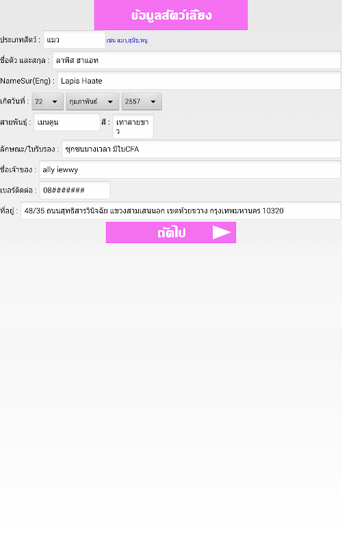 - ข้อมูลในบัตรครบถ้วน อาทิเช่น พันธุ์ สี เจ้าของ เบอร์โทร ลักษณะ/ใบรับรอง ช่องเพิ่มเติมที่สามารถลงรายละเอียดเพิ่มได้