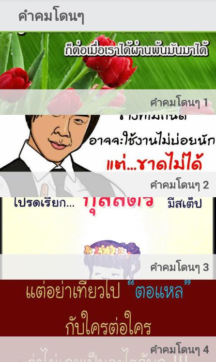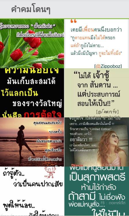 แอพพลิเคชั่นรวบรวมรูปภาพคำคมโดนๆ ไม่ว่าจะเป็นคำคมความรัก, คำคมอกหัก, กลอนกวนๆ คำคมโดนใจวัยรุ่น วัยทำงานมากมาย อ่านแล้วโดน อ่านแล้วแทงใจดำ อ่านแล้วสร้างกำลังใจ หลากหลายอารมณ์ สามารถเซ็ตเป็นวอลเปเปอร์, เซฟเก็บไว้ในเครื่อง หรือแชร์ให้เพื่อนๆ ดูได้ โดยจะมีการอัพเดตคำคมโดนๆ เพิ่มขึ้นเรื่อยๆApplications compiled with pictures of Denver. Whether Love Quotes, Love Quotes, Quotes, Poems provocative teenage students. Then I read a lot of working-age hit the nail on the head. Read inspirational Mixed emotions Can be set as wallpaper, saved in the machine. Or share it with your friends by Quotes are updated as new. Growing