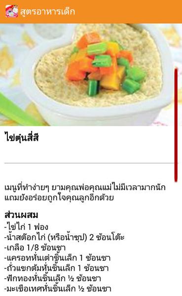 แอพพลิเคชั่นนี้ได้รวบรวมเมนูอาหารสำหรับเด็กวัย 1-3 ปี เป็นเมนูที่รวมสารอาหารตามที่ร่างกายเด็กวัยนี้ต้องการ เพื่อให้เด็กมีร่างกายที่สมบูรณ์แข็งแรง มีส่วนสูงและน้ำหนักตามมาตรฐานที่ตั้งไว้ และยังมีสูตรอาหารสำหรับเด็กอ่อน วิธีทำอาหารเด็กเล็ก เมนูเด็กโต รวมถึงขั้นตอนวิธีการผลิต อาหารสำหรับลูกมากมาย ให้คุณแม่ที่ใส่สุขโภชนาการของลูกได้นำไปลองทำให้ลูกๆ สุดที่รักของคุณทาน โดยมีสูตรอาหารเด็ก ดังนี้