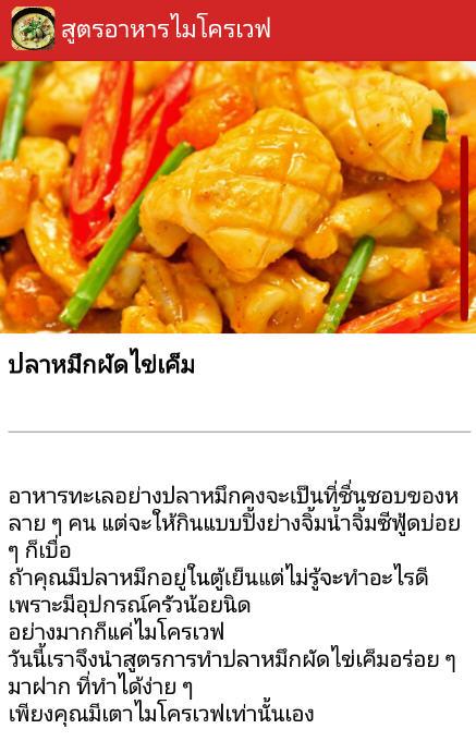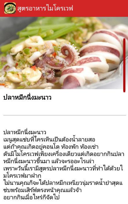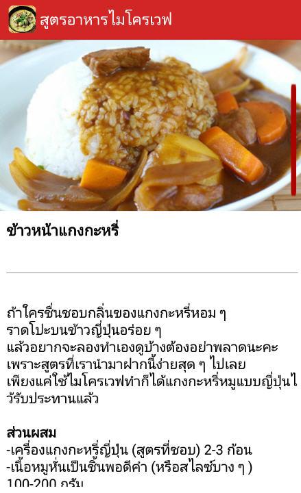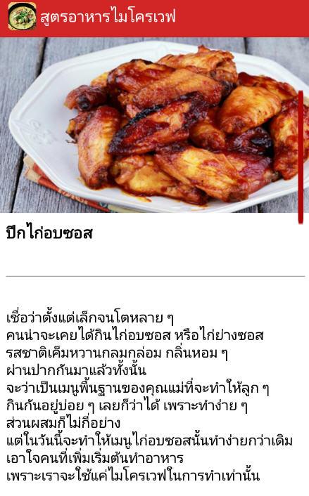 แอพพลิเคชั่น สูตรอาหารไมโครเวฟ รวบรวมสูตรอาหารมากมายหลายชนิดที่สามารถใช้ไมโครเวฟในการทำได้ สะดวกสำหรับผู้ที่อยู่ห้องเช่าหรือหอพัก ที่มีข้อจำกัดในการทำอาหาร เพียงแค่มีไมโครเวฟก็สามารถทำอาหารได้มากมายหลายชนิด โดยสูตรอาหารไมโครเวฟประกอบไปด้วย