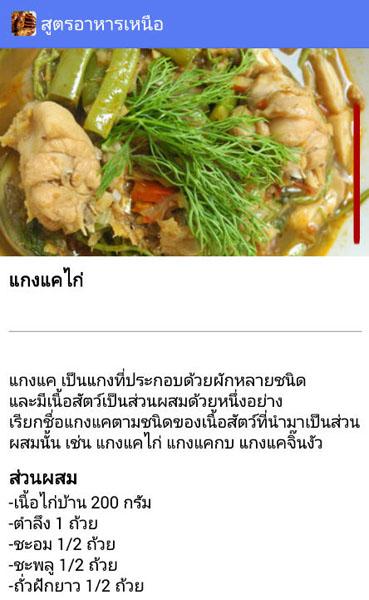 แอพพลิเคชั่น สูตรอาหารเหนือ ได้รวบรวมสูตรอาหาร วิธีทำ อาหารภาคเหนือเอาไว้ โดยประกอบไปด้วยเมนูดังต่อไปนี้