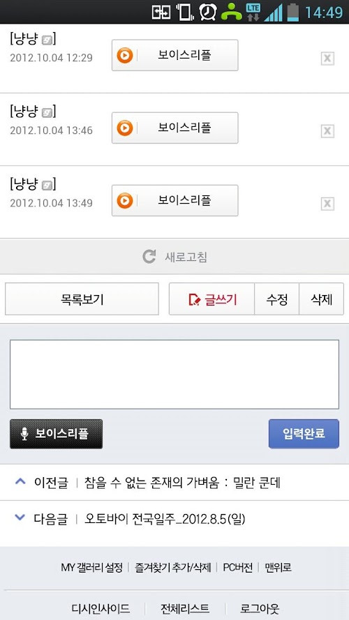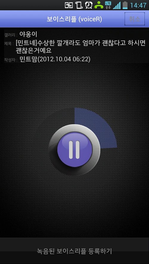 Comments registration area of 'ripple Voice' play button (black) after installing the Voice ripple from DC Inside Mobile Web (m.dcinside.com) When you click the App Voice ripple runs, the recording is available.