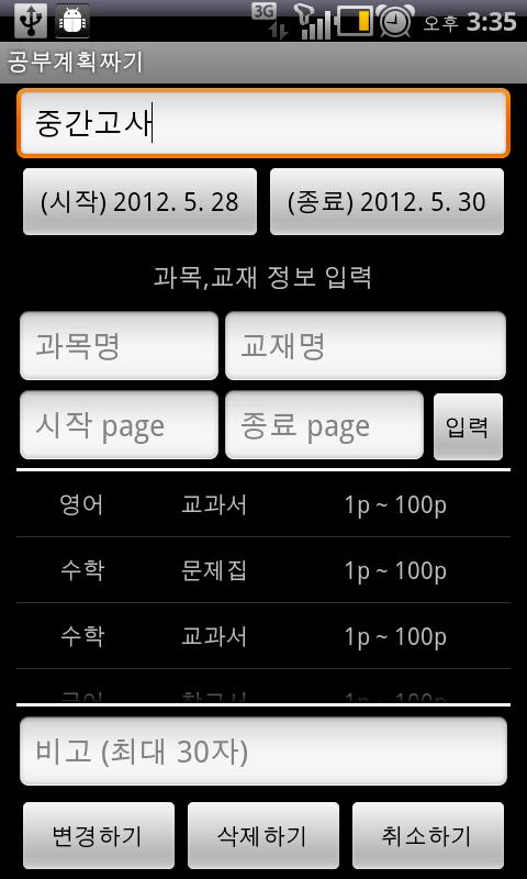 2) 과목명,교재명,시험 범위를 입력 후 ‘입력’ 버튼을 클릭하세요.