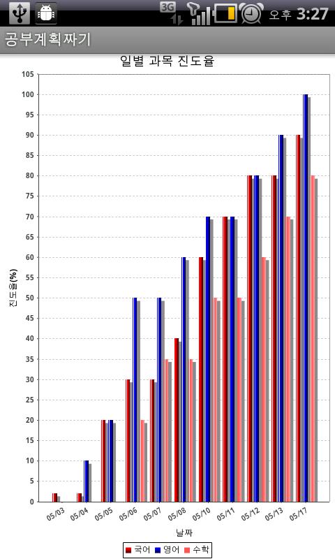 4. 일별 진도율 보기 : 3번에서 기록한 진도 정보를 이용하여 일별 진도율을 그래프로 보여줍니다. (유료 버전에서만 지원합니다.)