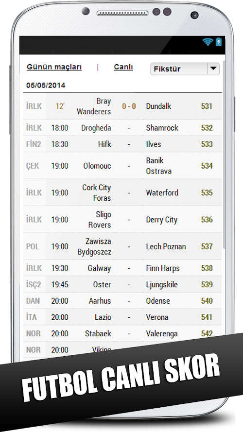 Program içerisinde ki canlı skor verileri anlaşmalı olarak www.mackolik.com ve www.macsonuclari.net'den sağlanmaktadır.Programımızla ilgili diğer kullanım koşulları ve lisansları görmek için program içerisinde telefonunuzun menü tuşuna basın ve program içerisinde açılan pencerede lisans - kullanım koşulları sayfasına gidin.If you want to follow live match scores, this program is for you. Have played the game or have wondered second of the match thanks to this program you can follow them. The program is available in both football and basketball matches and all matches are reflected to you in the most accurate way.