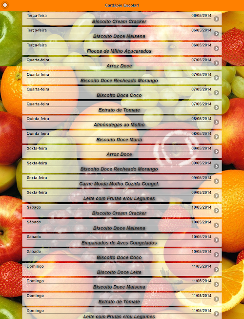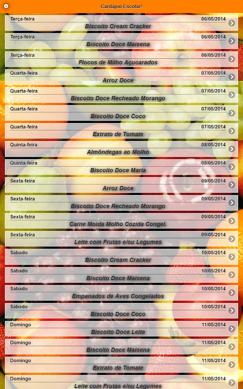 Cardápio Escolar é um aplicativo com o cardápio mensal das escolas do estado de São Paulo, que fornece aos usuários os valores nutricionais e permite compartilhar dando a sua opinião sobre o cardápio!School Menu is an application with a monthly menu of schools in the state of São Paulo, which provides users with the nutritional values and allows sharing giving his opinion on the menu!