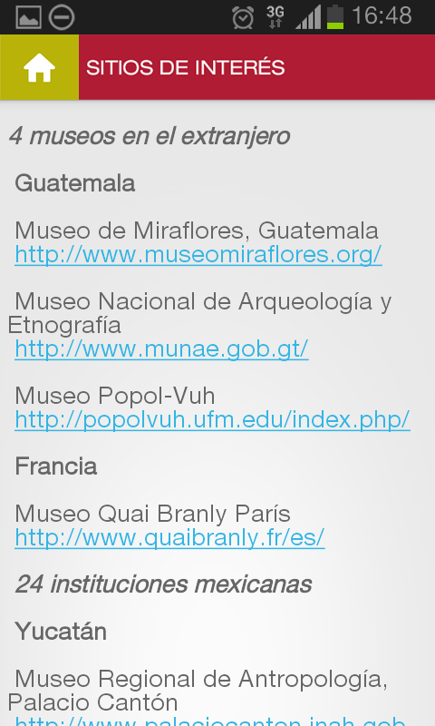 Contains reading contemporary Mayan poetry, in the voice of the author, both Spanish and Maya. It also contains additional information after the visit as links to all 28 museums and institutions in Guatemala and Mexico, who provided work for the show.