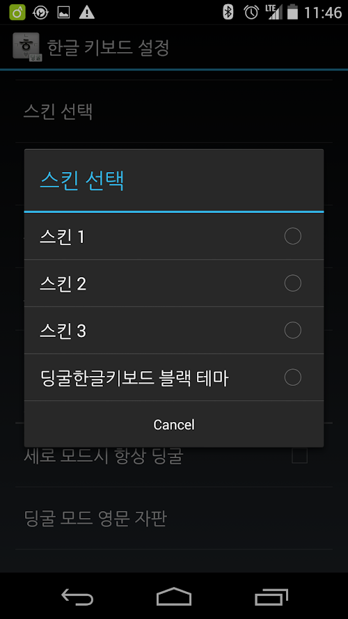 3. Long click Options button -> Options -> Select skin -> Choose dinggul Hangul Keyboard Black Theme