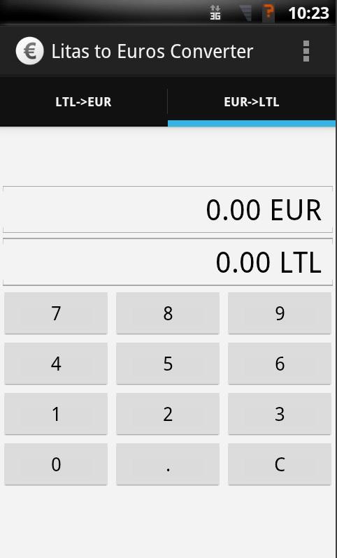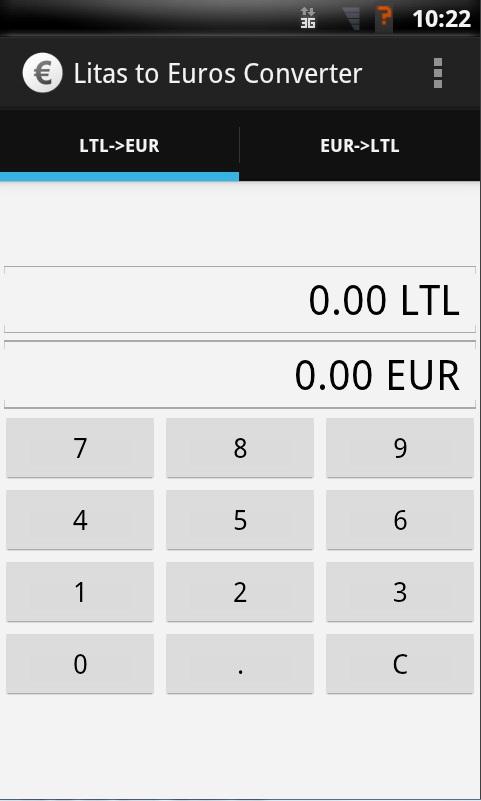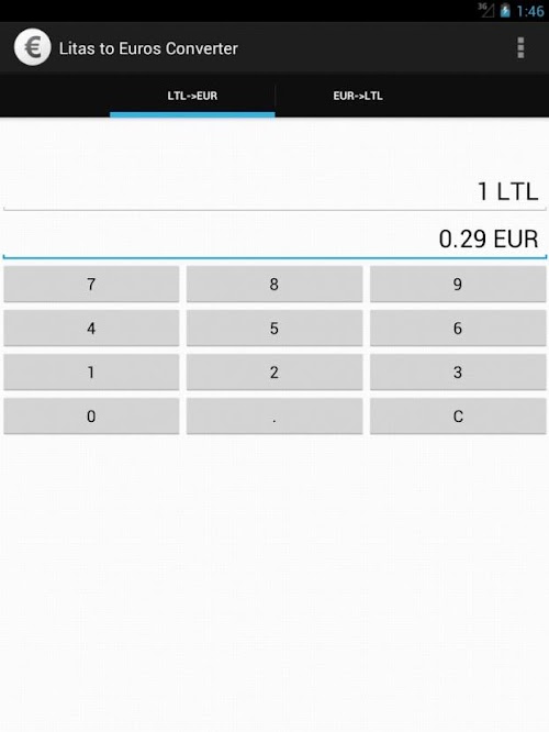 Nemokama litų į eurus skaičiuoklė. Nebevargsite dalindami ir daugindami kainas iš 3.4528. Aplikacija pinigų neatneš, bet laiko sutaupys.