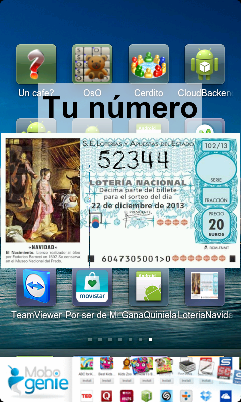 Esta aplicación te sugiere un número para el sorteo de navidad del 22 de diciembre de 2013. Se basa en analizar determinada información del móvil.This application will suggest a number for the Christmas draw December 22, 2013. Analysis is based on information given mobile.