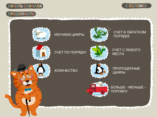 Во время обучения ребенка будет сопровождать симпатичный персонаж – Кот Ученый. А считать он будет барашков, пингвинов и кузнечиков. И ему точно не будет скучно. А значит, учиться он будет легко и с удовольствием.Every responsible parent concerned about your child's intellectual development. Already in pre-school age to be laid and develop basic skills that will be useful in school. The purpose of this application is simple and clear: teach your child to count.