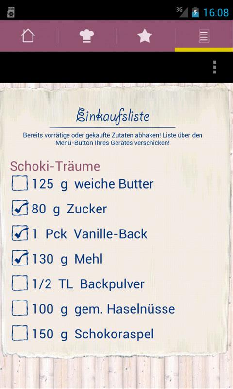 Setzen Sie alle Zutaten, die Sie für Ihre Backrezepte benötigen, auf unsere interaktive, praktische Einkaufsliste. Und: Streichen Sie jene Zutaten ab, die Sie nicht brauchen oder bereits vorrätig haben