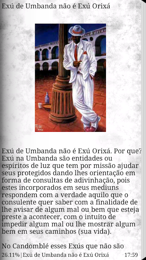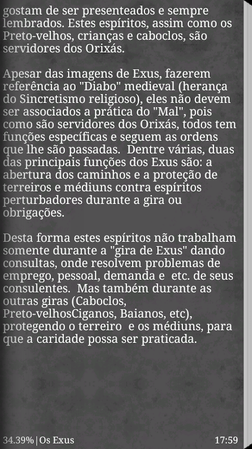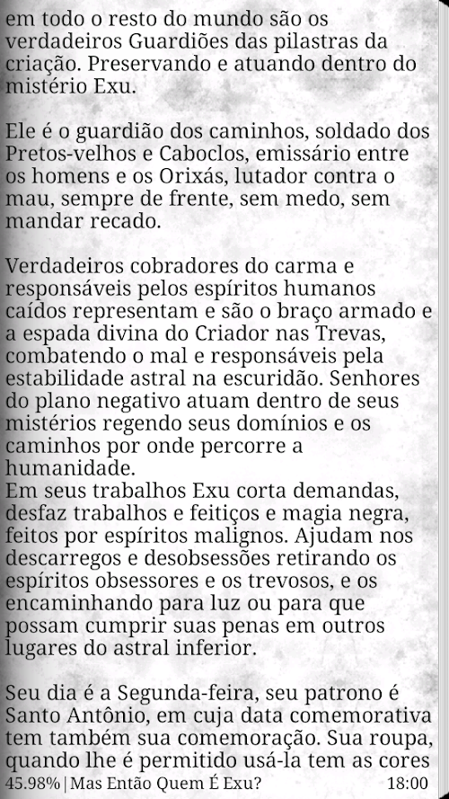 Neste livro você encontrará informações sobre a história de Exú, as diferenças entre o Exú Orixá e o Exú da Umbanda, características, simpatias, mitologia, oferendas, e muito mais!Exú of Umbanda is not Exú Orisha. How come? Exú in Umbanda are entities or spirits of light whose mission is to help his protégés giving them guidance in the form of divination queries, as they incorporated into their mediums respond with the truth what the questioner wants to know in order to warn you of some bad or good that is about to take place, in order to prevent harm or show you any good in his ways (your life).