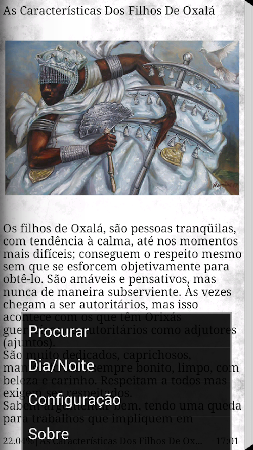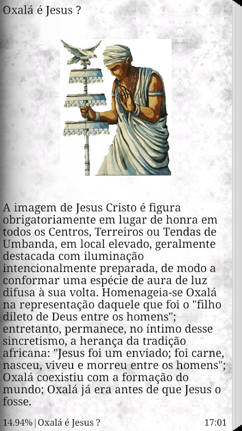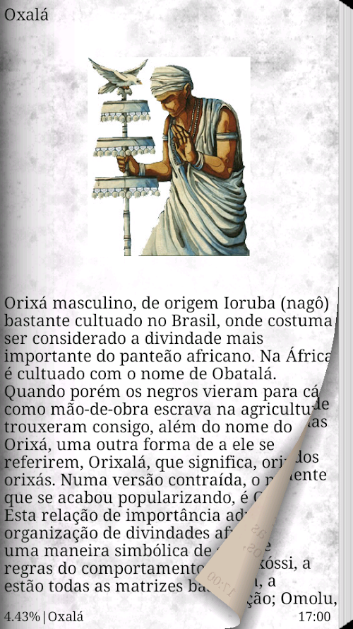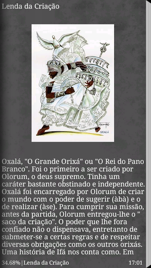 Neste livro você encontrará informações sobre a história de Oxalá, características, simpatias, mitologia, oferendas, e muito mais! Male Orisha of Yoruba origin (Nago) very worshiped in Brazil, where usually considered the most important deity of the African pantheon. Africa is worshiped under the name of Obatala. Nevertheless when blacks came here as labor, slave labor in agriculture, brought with them, and the name of the Orisha, another way to refer to it, Orixalá, which means, deity of deities. A contracted version, the name that is just more popular, is OSHALA.