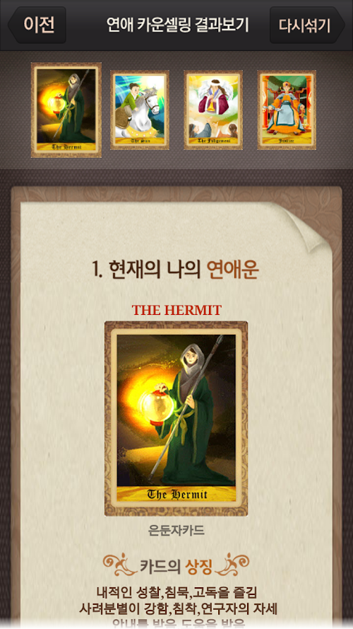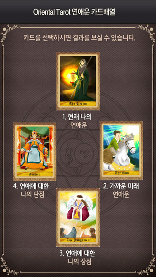 [나의 연애 카운셀링]은 4장의 타로 카드로 나의 연애에 대해 알려 줍니다.