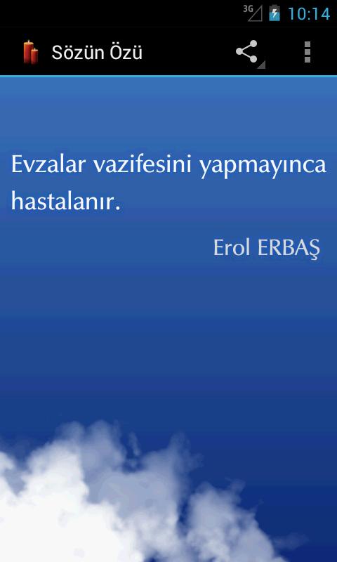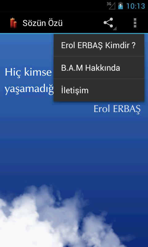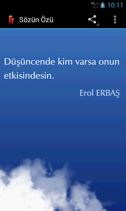 Sözler arasında bir parmak hareketiyle geçiş yapabilir, sözleri paylaşım butonuyla mesaj olarak gönderebileceğiniz gibi Twitter, Facebook gibi sosyal ortamlarda da paylaşabilirsiniz. Seçenekler menüsünden de uygulama, Bursa Başarıyı Artırma Merkezi ve Erol ERBAŞ ile ilgili ayrıntılı bilgi edinebilirsiniz.