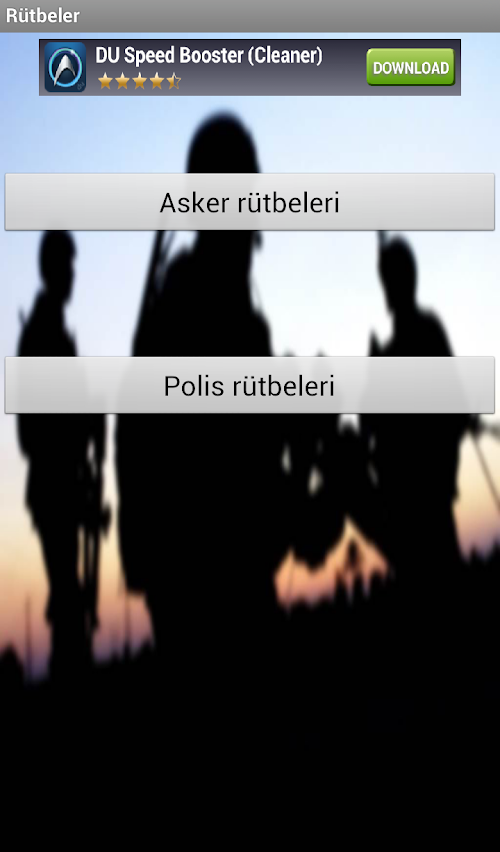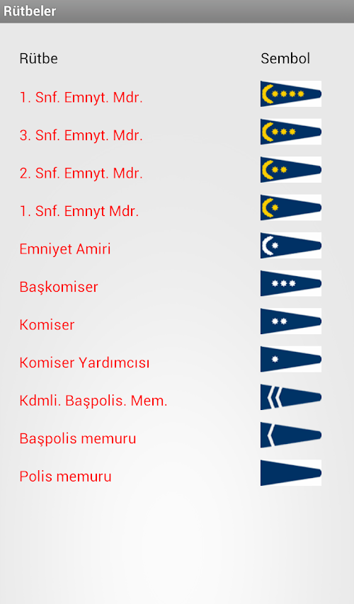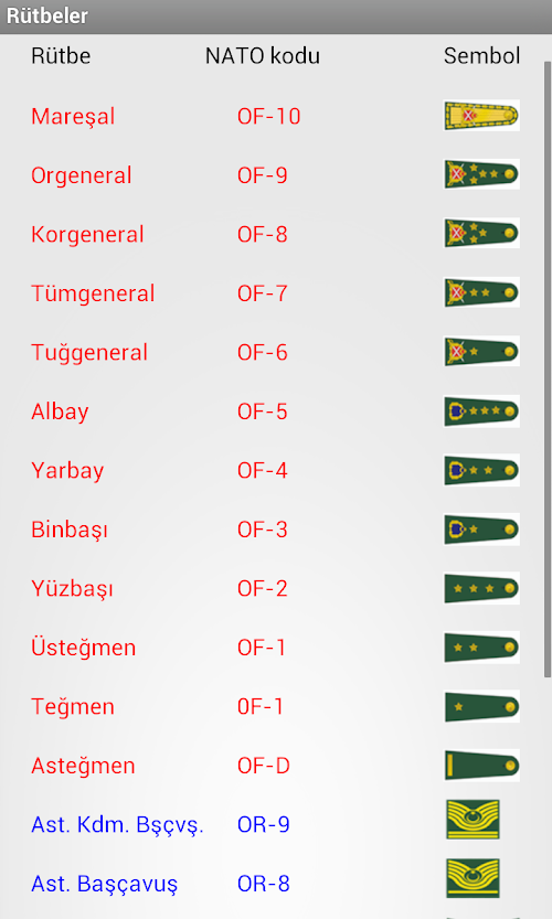Rütbe, polis, asker, NATO, er, onbaşı, çavuş, general, albay, yüzbaşı, astsubay, subay, başpolis, başkomiser, emniyet amiri, TSK, EGM, Türk Silahlı Kuvvetleri, Emniyet Genel MüdürlüğüThrough this program, military and police ranks can be learned easily and you can see the marks of rank. In addition, the NATO military rank in return you can see in the system. Additionally, the application menu "on the program" part of the resources used in the preparation of the program, abbreviations and other details you can learn