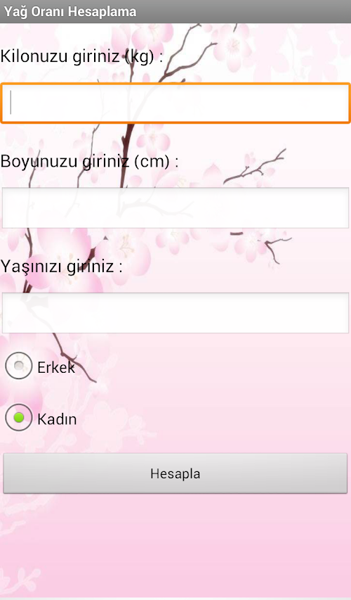 Bu program aracılığıyla Yağ Oranınızı öğrenebilirsiniz. Ayrıca program şu anki yağ oranına göre durumunuzu (ideal, normal, fazla vs.) ve sahip olmanız gereken yağ oranını gösterecektir. Oldukça basit ve kullanışlı bir programdır. Boyutunun küçük olması sebebiyle telefonunuzda yer kaplamaz, takılmalara yol açmaz. Ek olarak bu program aracılığıyla Vücut Kitle Endeksinizi öğrenebilir ve isterseniz https://play.google.com/store/apps/details?id=com.uusoftware.idealkilohesaplayici adresindeki programımız aracılığıyla ideal kilonuzu ve kilo durumunuzu öğrenebilirsiniz.