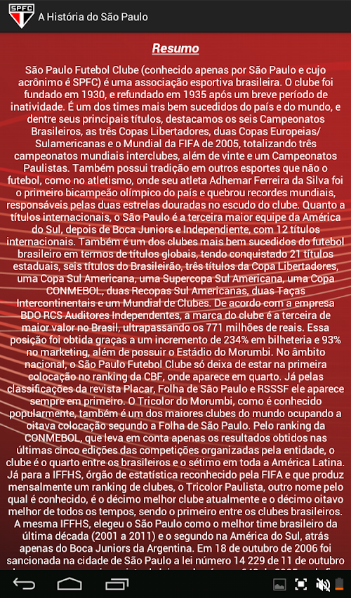 Todo o conteúdo desse aplicativo foi encontrado na internet e o resumo do que foi coletado está resumido nesse aplicativo. The content of this application describes the history of São Paulo Futebol Clube (SPFC), which is also known as Tricolor Paulista, Sovereign and Tricolor do Morumbi.