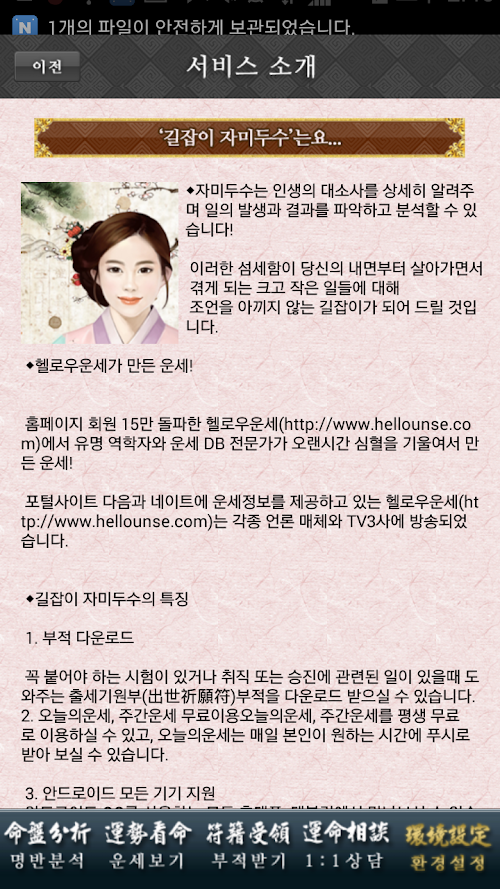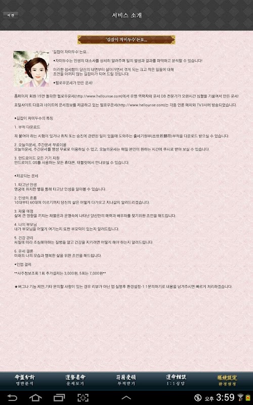 인터넷 및 모바일 운세 서비스를 하는 헬로우운세에서 유명 역학자와 운세 DB 전문가가 오랜시간 심혈을 기울여서 만든 운세!