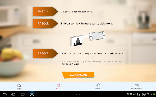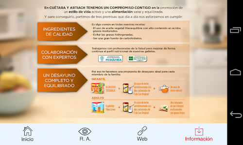 Es muy fácil, tan sólo debes descargarte la aplicación, enfocar tu caja de galletas Cuétara o Artiach y descubrir los contenidos de calidad de la mano de nuestra nutricionista virtual y las galletas Dinosaurus, Marbú 0%, Digestive 0%, campurrianas 0%, Fibra Linea 3 Cereales, Fibra Linea Soja y Marbú.Breakfast is basic to achieve successfully face our daily challenges with the necessary energy. This application presents recommendations from a nutritionist for a balanced diet in a simple, fun and very visual way, thanks to Augmented Reality.