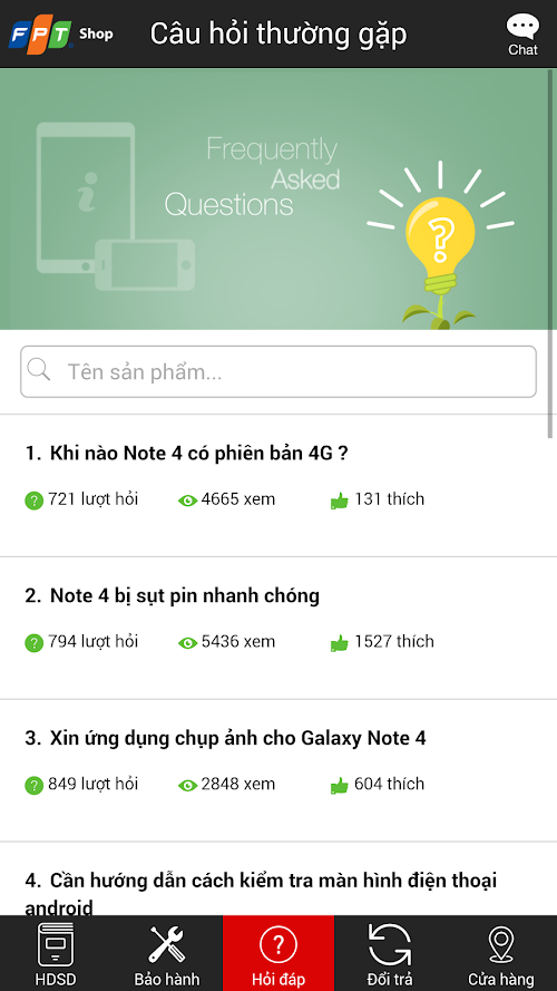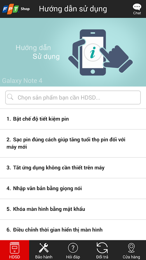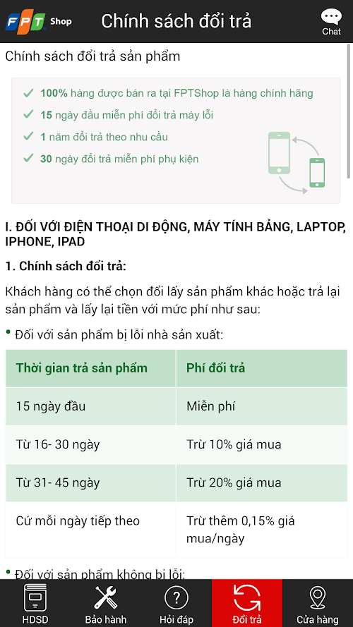 Ứng dụng FPT Shop là thư viện tính năng hữu ích như hướng dẫn sử dụng, tra cứu thông tin bảo hành, các chính sách hấp dẫn của FPT Shop,... và đặc biệt là chat trực tuyến. Applications FPT Shop is a library of useful features such as manuals, warranty information lookup, the main attraction of the FPT Shop, ... and especially online chat.