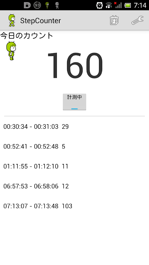 一日の総歩数とともに、細かい歩数(たとえば家を出てから駅に着くまで)を歩行開始・歩行終了の時刻とともに記録します。