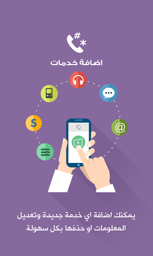 - هنا يمكنك من اضافة الخدمات التي غير موجودة في التطبيق وتدعمها شركة الاتصالات الخاصة بك سواء كانت اكواد ( #, * ) او رسائل قصيرة SMS.