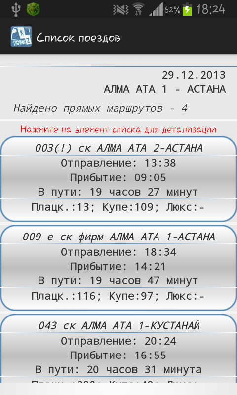 The application can be useful for those who use the word in the search: timetable of trains, Kazakhstan, KTZ, railway tickets, search sites, train schedules, Kazakhstan, Kazakhstan, poyyz, Families, Astana, Almaty, Karaganda, Aktau, Ust-Kamenogorsk, Pavlodar, Taraz, Kokshetau Temir Jol