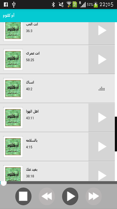االتطبيق يشمل جميع أغاني الفنانة ام كلثوم بصيغة mp3 وامكانية تشغيلها بطريقة متتالية وبسرعة عاليةAalttbaiq includes all the songs singer Om Kalthoum mp3 format and the possibility to run consecutive manner and at high speed