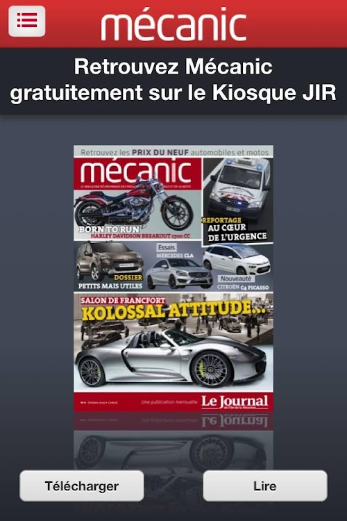 -Easily access the e-magazine, MECANIC enriched through the application BOOTH "The Journal of the island." Your magazine auto / motorcycle Reunion favorite digital enhanced version: more videos, more pictures, more interactivity!