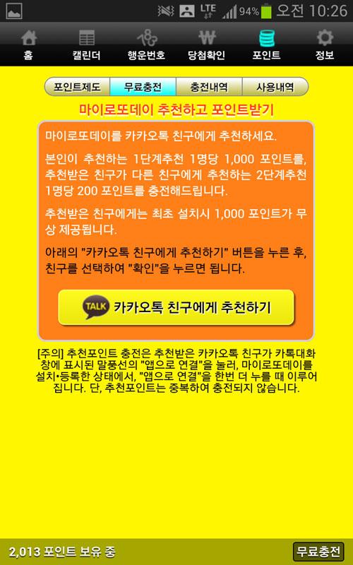 One of the advantages of my horoscope analysis of lottery numbers all day to experience willingly, so you can enjoy fun, it offers 1,000 points during the first installation free of charge, recommendations point system, point system items, operating a non-winning point system The. In particular, KakaoTalk Tell a Friend gives Charge the Points 1,000 points, if the number can not be purchased horoscope analysis we will earn the winner has won no points to 500 points.