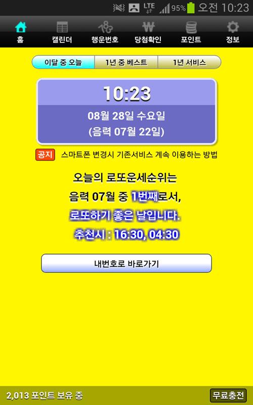 로또 운세는 캘린터(달력) 형태와 함께, "이달 중 오늘"의 로또운 순위와 종류(로또하기 좋은 날, 보통인 날, 나쁜 날), 또는 "1년 중 베스트"인 로또월운의 순위와 종류, 로또하기 좋은 날의 일자와 좋은 시간을 알려줍니다.